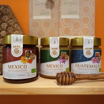 Draußen summen die Bienen und sammeln nun eifrig Nektar für die nächste Honigernte. Bei uns im Weltladen schon jetzt erhältlich: Der beliebte Bio-Honig von GEPA und dazu allerlei Dekoratives, wie Filzbienen und Untersetzer im Honigwaben-Design.