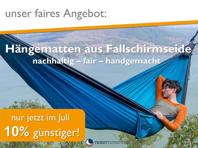 Die superleichten und kompakt zusammenfaltbaren Hängematten und Mini-Backpacks aus Fallschirmseide von Ticket to the Moon.