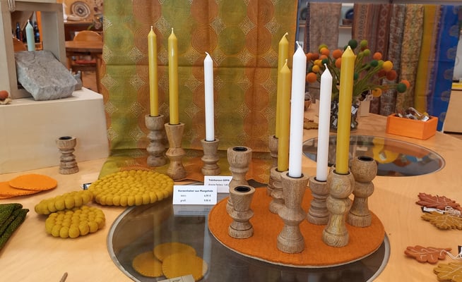 - Tafelkerzen von GEPA und Kerzenhalter aus Mangoholz von GLOBO ergänzen sich wunderbar für einen stimmungsvoll gedeckten Tisch.