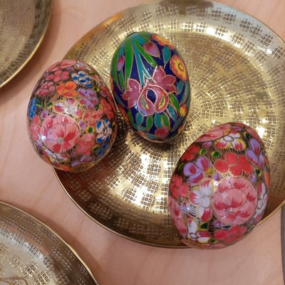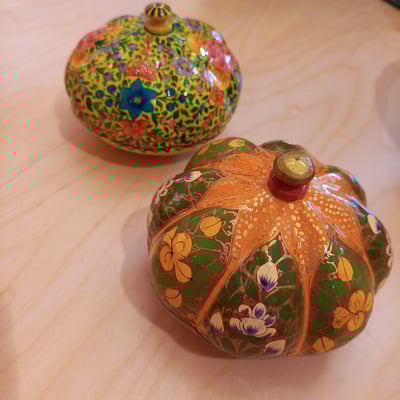 Aufwändig handbemalt in bunten Farben und detailverliebten Blumenmustern von dem kleinen Familienbetrieb Jalaluddin in der Region Kaschmir in