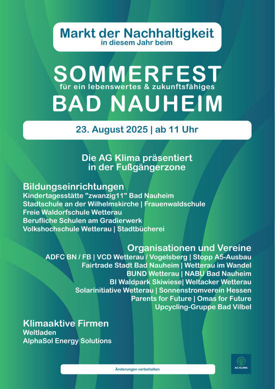 Am 23. August 2025 findet im Rahmen des "Sommerfests für ein lebenswertes & zukunftsfähiges Bad Nauheim" der "2. Markt der Nachhaltigkeit" statt. Die Parkstraße wird an diesem Tag