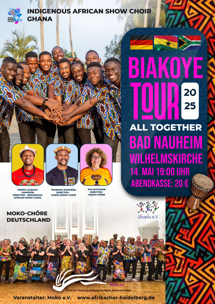 Biakoye bedeutet „kommt alle zusammen“! Unter diesem Motto treffen sich dieses Jahr die Moko-Chöre aus Deutschland mit dem ghanaischen Männerchor Indigenous African Show Choir zu einer gemeinsamen Tournee. Ihre Chorleiter Eva Buckmann, Thabang Mokoena und Pasado Acquah-Sampson arbeiten schon seit Jahren zusammen und überraschen ihr Publikum immer wieder mit neuen Chorformationen, Kompositionen und Klangerlebnissen aus Afrika. Eva Buckman und Thabang Mokoena sind die führenden Köpfe von Moko e.V. aus Heidelberg, dem Verein zur Förderung der Musik, Kunst und Kultur Afrikas! In dieser Rolle arbeiten beide seit vielen Jahren sowohl in Südafrika und Ghana, als auch in Deutschland erfolgreich zusammen. Pasado Acquah-Sampson ist für unser Stammpublikum auch ein bekanntes Gesicht: In den letzten beiden Jahren war er zusammen mit zwei weiteren Sängern aus seinem Indigenous African Show Choir bereits mit dabei in unserem Umoya Munye Ensemble. Nun ist er mit seinem eigenen ghanaischen Show-Chor bei uns. Es erwartet Sie eine fesselnde, authentische Gesangs-, Tanz- und Trommelshow mit kulturellen Darbietungen aus Ghana und ganz Afrika.